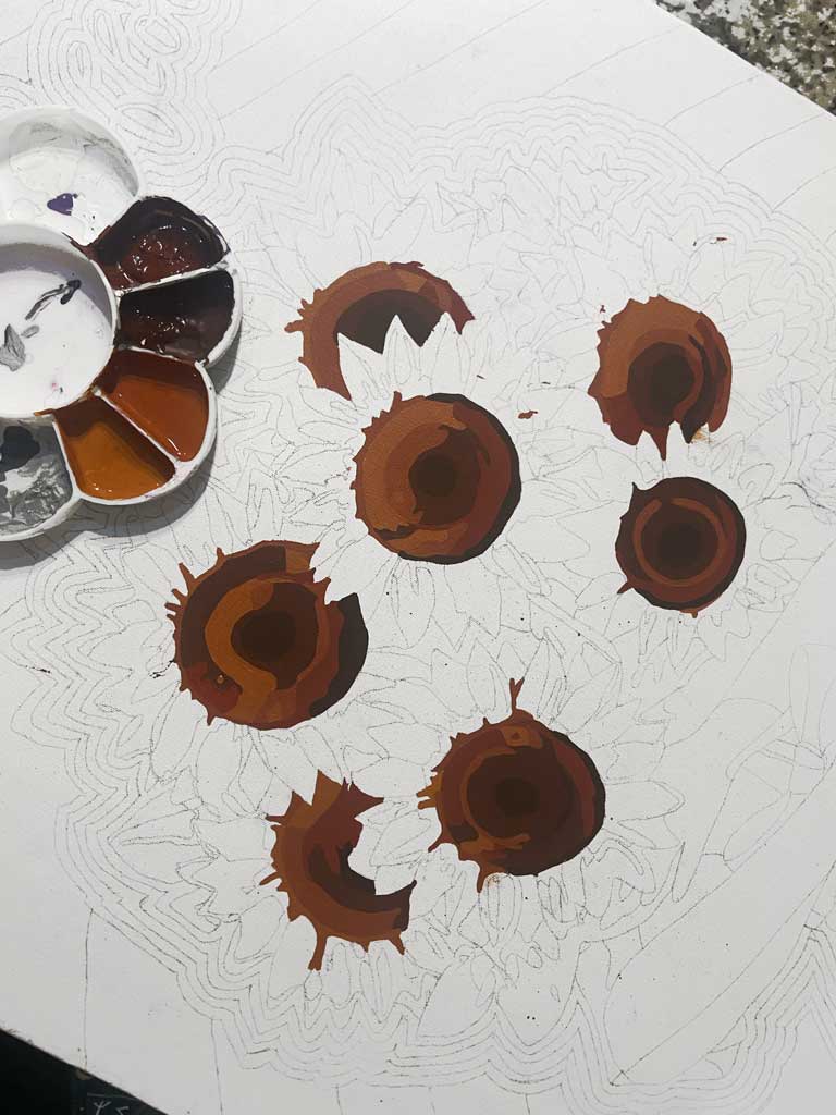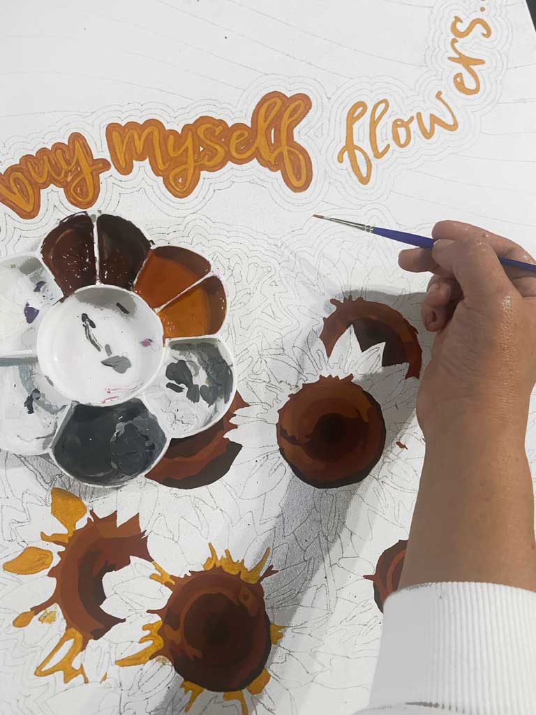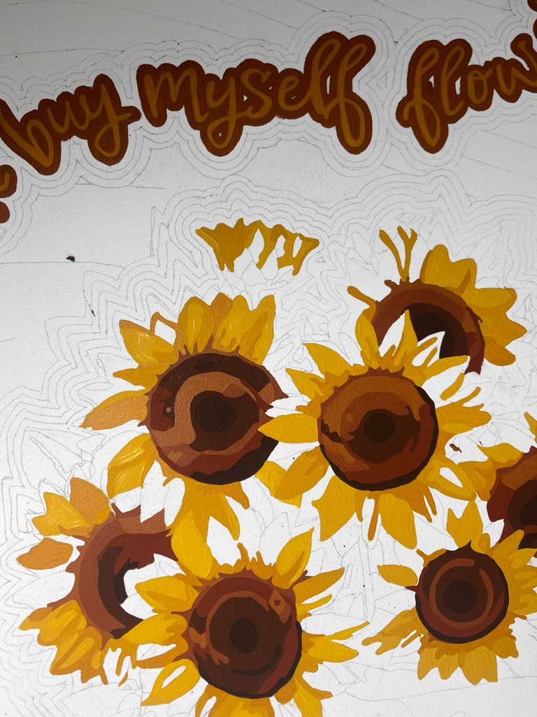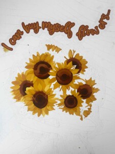 Sunflowers hold a very specific meaning in this work. Their vibrant yellow color and their instinctive inclination toward light represent positivity, growth, and resilience. They are flowers associated with warmth and vitality, but also with effort—the continuous act of turning toward what allows us to grow. By placing them at the center of the composition, I emphasize self-love not as a passive feeling, but as an active practice that requires intention and care.