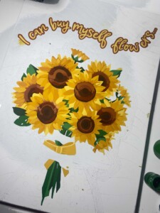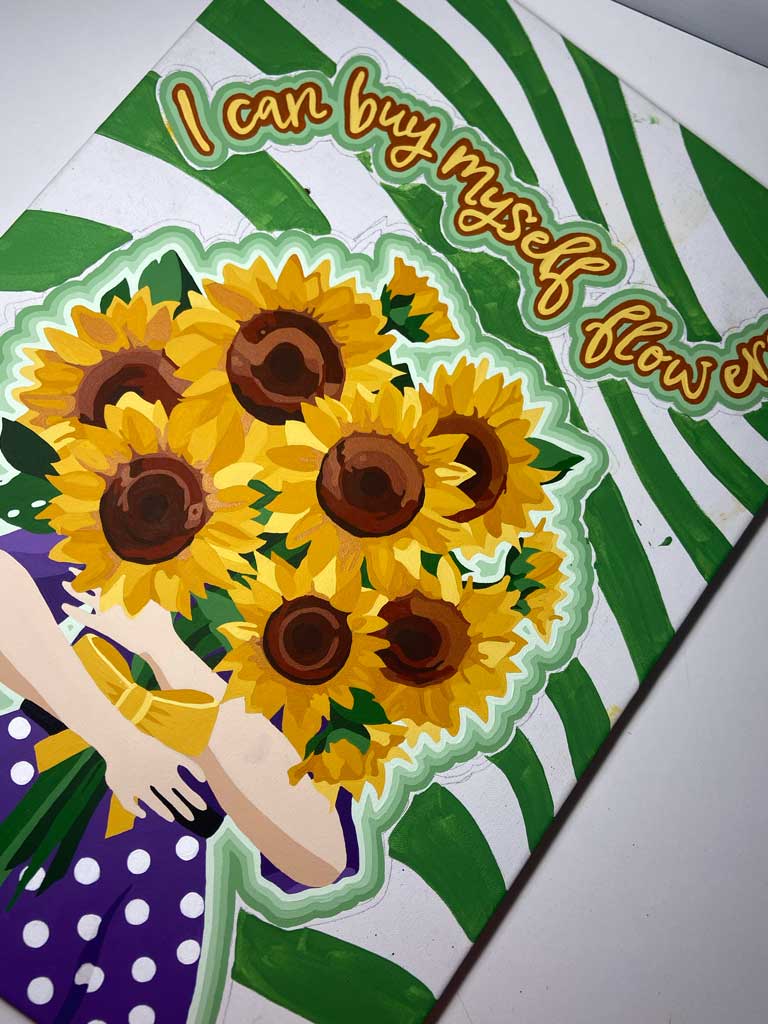 The phrase I can buy myself flowers…, inspired by the song Flowers by Miley Cyrus, functions as both a declaration and a quiet reminder. For me, it speaks to independence, but also to tenderness. It insists that care, affection, and celebration do not have to come from elsewhere—they can be initiated from within. In a culture that often encourages women to seek validation, love, or fulfillment through others, this statement pushes back against that narrative and affirms self-sufficiency as a form of empowerment.